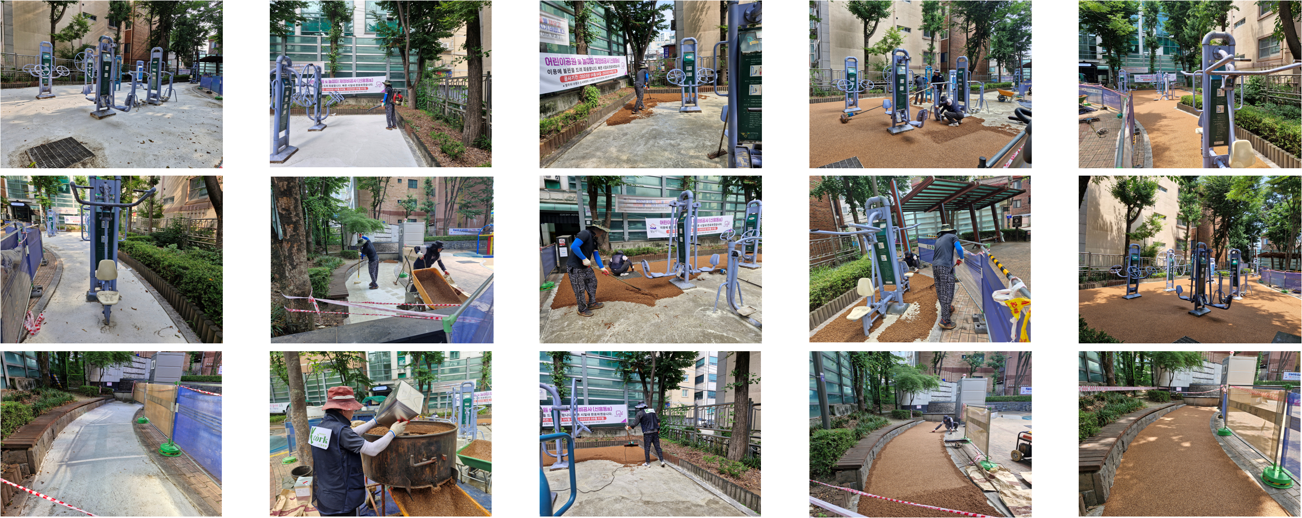 코르크칩,코르크포장,코르크바닥포장재,보행매트,야자매트,야자수매트,코아람,최우수등급,계약이행실적평가,화성시,경기도,고양시,조달청,학교,교육청,운동장,배수로,토사유입,체육기구하부,코팅